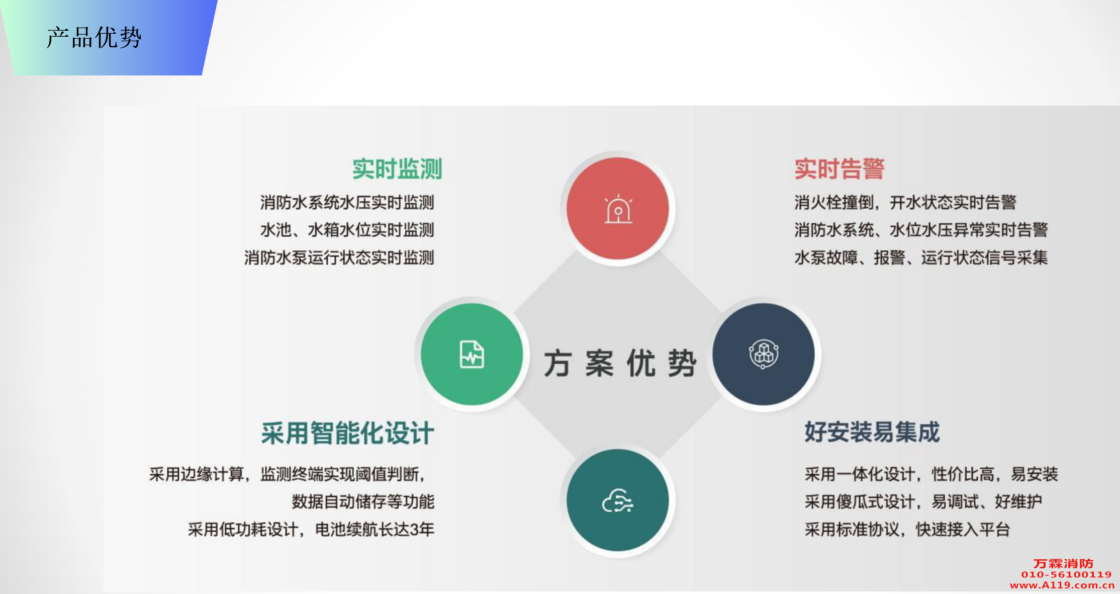 万霖物联网通过对消防行业的深入了解,利用多年在物联网行业积累的联网 技术解决消防栓系统管网水压、水池水位、水泵控制器状态以及阀门、消防栓状 态(撞倒、水压、漏损)等信息采集及传输问题。